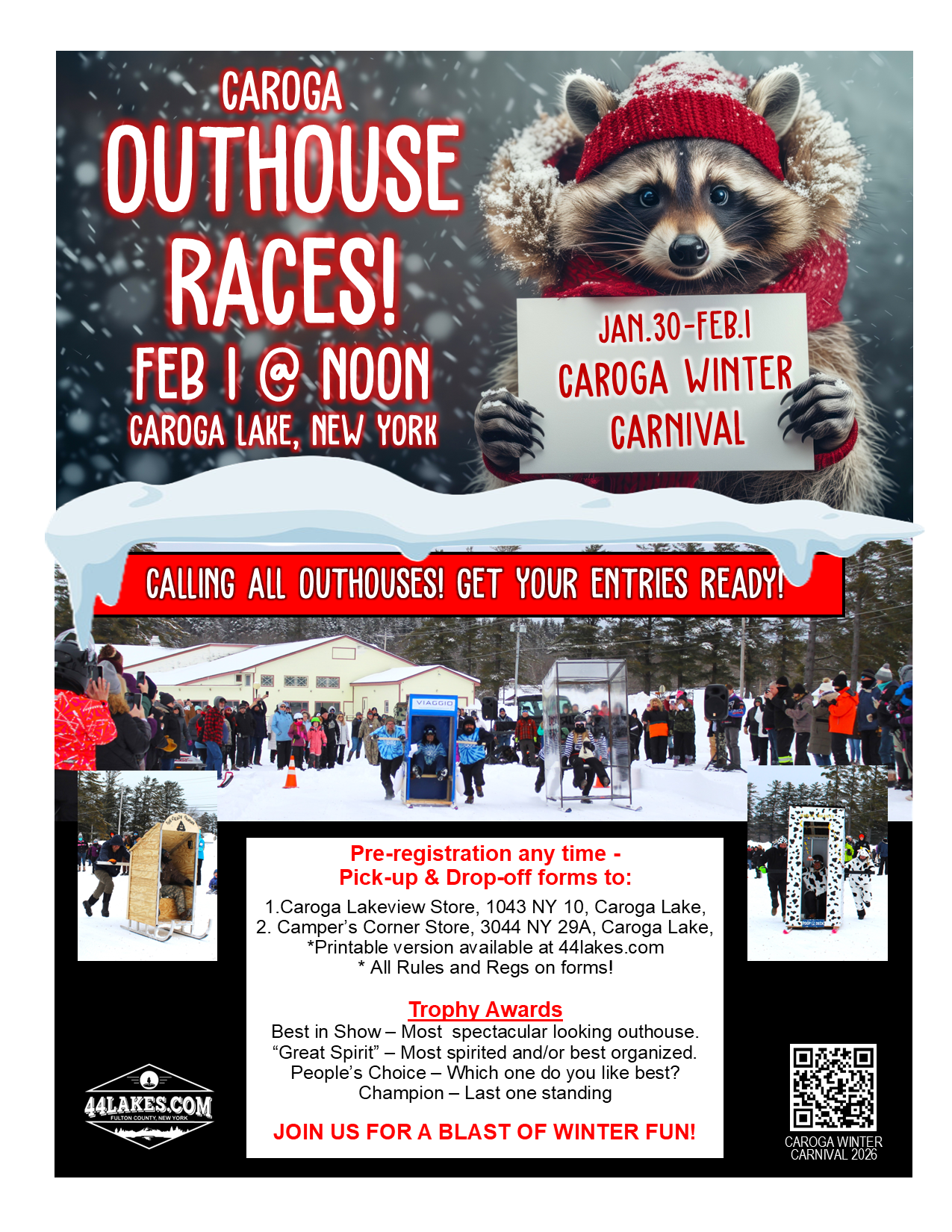 The carnival weekend will consist once again with the vintage snowmobile show, new this year – a lighted snowmobile rave parade on West Caroga Lake at dusk followed by a fireworks display presented by the Fulton County Visitors Bureau. The extremely anticipate Outhouse Races will once again fly across West Caroga Lake on Sunday, information will be available at the Caroga Lakeview Store.