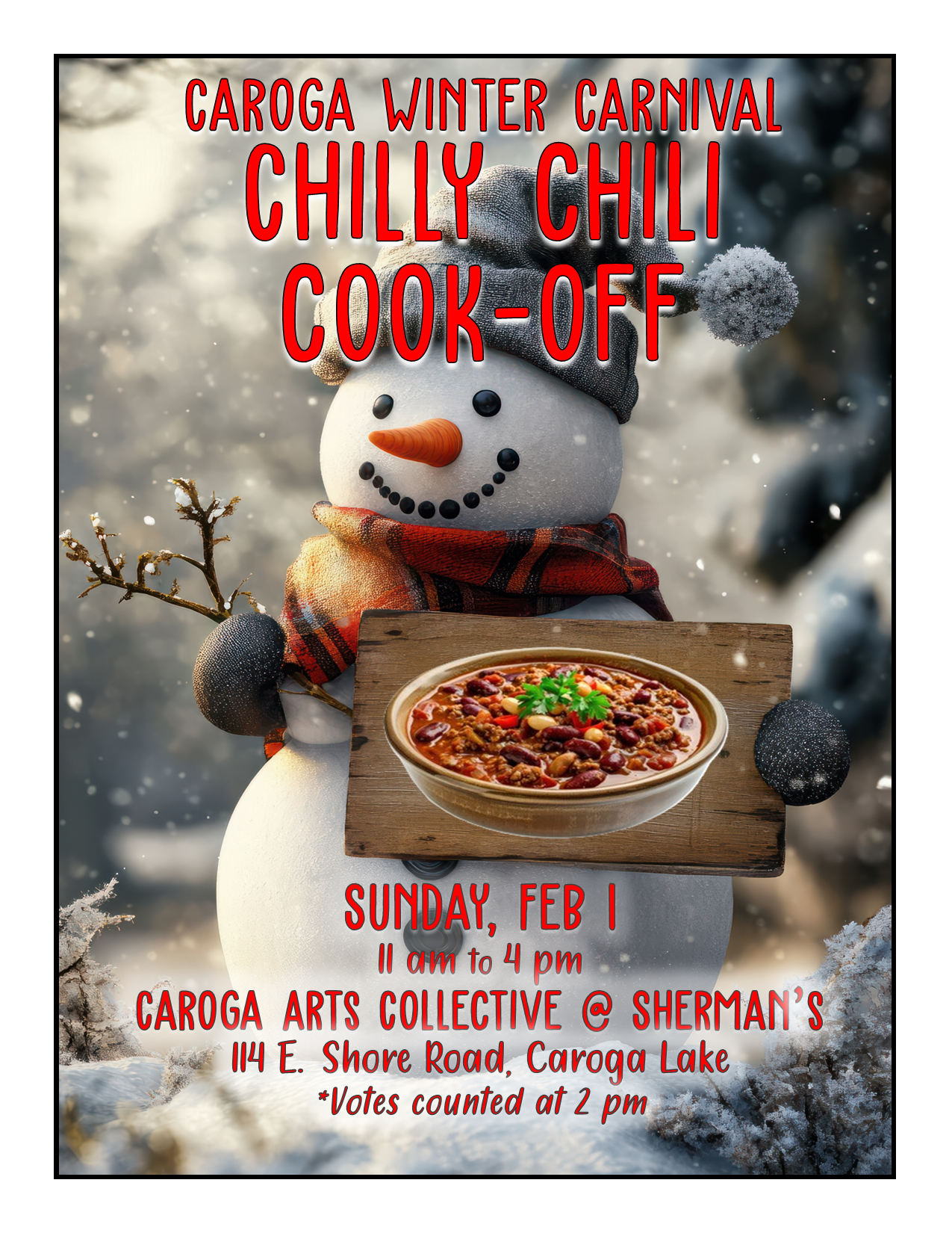 Plans are shaping up for another kids ice fishing clinic, a pancake breakfast, the chilly chili cook-off, and an endless variety of winter activities. Vrooman’s snow-volleyball tournament, and nightly live music is planned. This is a town-wide event with local businesses, merchants and organizations all participating in their own way. Much more information is to come.